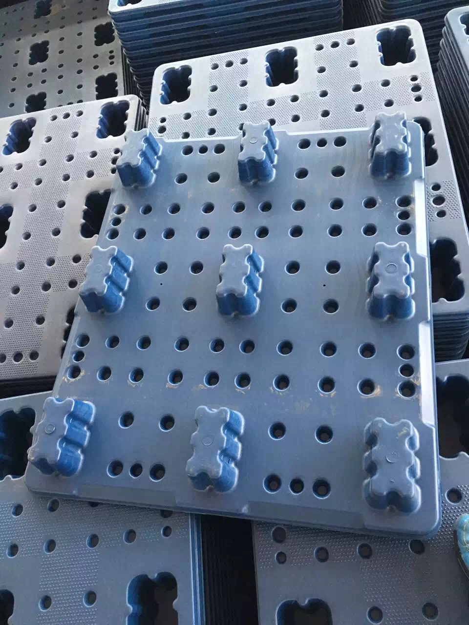 5、九腳塑料托盤的通常動載為0.5T,靜載為1.5T。